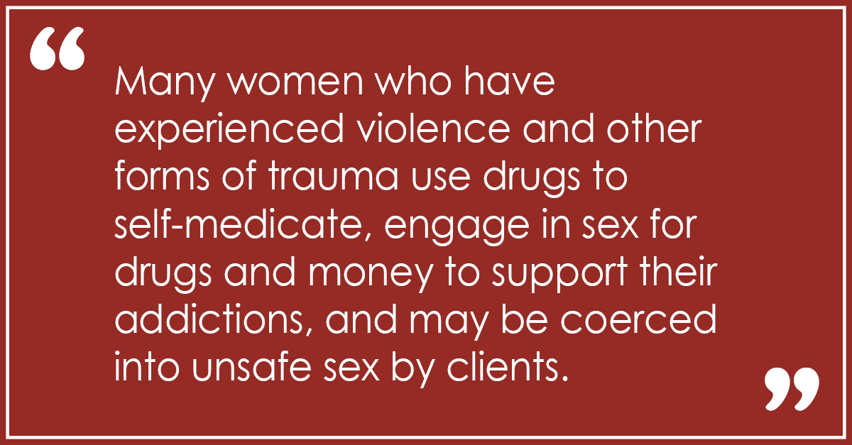 Another factor is women’s substance abuse, which has reached epidemic proportions. Women continue to contract HIV/AIDS through their own or their partners’ drug use and contaminated needles. Despite the fact that substance abuse has declined among black women (and is rising among white women) those who are addicted become particularly vulnerable to HIV/AIDS. Many women who have experienced violence and other forms of trauma use drugs to self-medicate, engage in sex for drugs and money to support their addictions, and may be coerced into unsafe sex by clients.